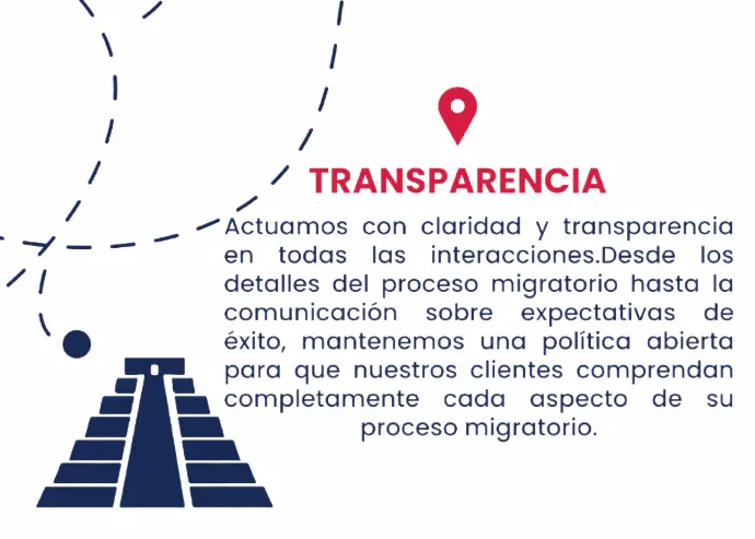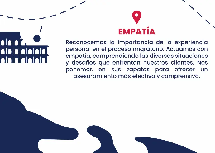 Nuestros valores nos proporcionan una base sólida para la cultura y la identidad de nuestra empresa, reflejando nuestro compromiso con la confianza, la transparencia, la excelencia, la empatía y compromiso en el servicio de asesoramiento migratorio.